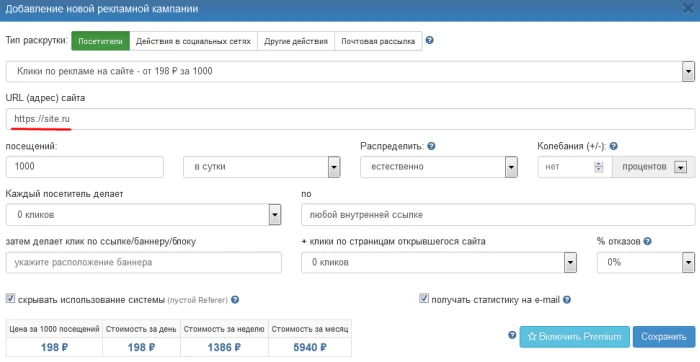 Fluctuations (+/-) – a random deviation in the number of visits, either up or down. For example, for 100 visits per day and a 5% fluctuation, the daily traffic distribution will range from 95 to 105 visits: Mon – 97, Tue – 103, Wed - 100, etc.